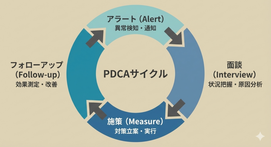なお、面談は「評価」ではなく「対話」である。筆者の経験では、離職予備軍は「聞いてほしい」サインを出していることが多い。AIのアラートはそのサインを拾うセンサーに過ぎない。「AIは扉、対話が鍵」という比喩を、現場研修で繰り返し共有したい。