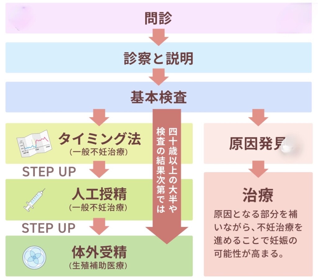 治療は「いきなり体外受精」ではなく、段階的に進みます。
