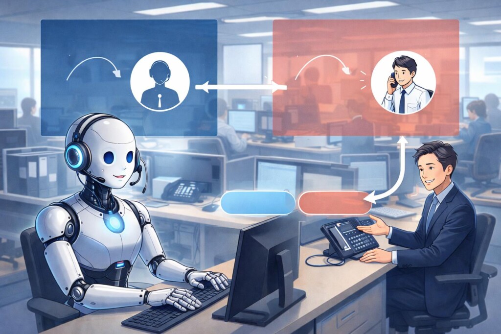 AIが受け持つのは受電の起点であり、人の仕事は案件の判断・合意形成・例外処理に寄る。AIに任せるほど、人の仕事の難度は上がるが、満足度と価値も上がる。